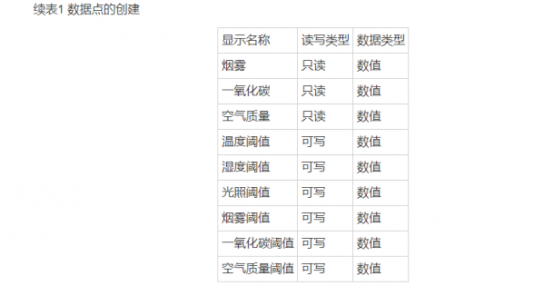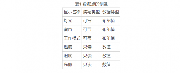 物联网监控管理平台由机智云物联网云平台的手机APP和Web端组成。在机智云官网进行注册并建立产品后,创建产品对应的数据点,数据点将设备的实际功能抽象化,描述产品的参数及功能。创建的数据点如表1所示。数据点与设备的功能一一对应,云平台与设备以及手机APP用确定的数据格式进行通信。
