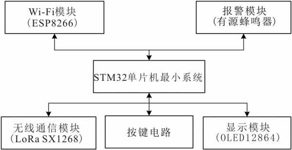 协调器子系统硬件主要包括STM32单片机最小系统、无线通信模块、按键电路、显示模块、Wi-Fi模块和报警模块等6个部分,硬件结构如图3所示。