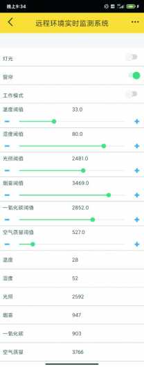 协调器子系统的OLED屏幕可以对环境信息、窗帘和灯光的状态、系统工作模式及阈值信息进行显示,如图8所示,此时手机APP显示的内容如图9所示。将手机APP显示的各项信息与OLED屏幕上显示的各项信息进行对比,二者保持一致。人为改变实际环境信息,OLED屏幕显示的信息和手机APP显示的信息均会同步更新。