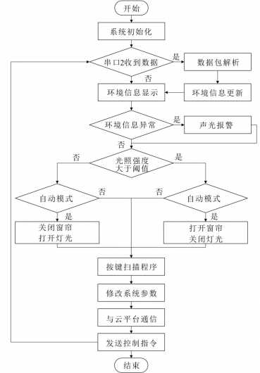 系统上电并初始化后,判断串口2是否收到环境信息数据包,若收到数据包则根据帧格式对数据包进行解析,即可得到环境信息,将环境信息显示在OLED屏幕上。当环境信息异常时,通过蜂鸣器进行报警。当系统处于自动模式时,若光照强度大于阈值时,则打开窗帘,关闭灯光;当光照强度小于阈值时,则关闭窗帘,打开灯光。随后进入按键扫描程序,通过按键可以对系统参数进行修改,也可以控制灯光和窗帘。与云平台进行通信时,将环境信息与系统参数上传至机智云物联网云平台,并从云平台获取控制指令。最后,将控制指令进行封装发送给电器控制子系统。