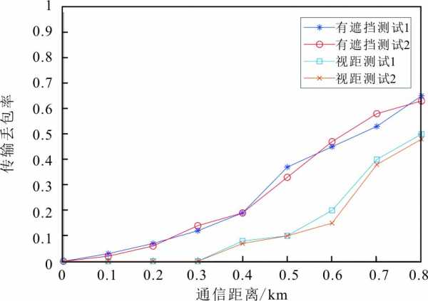 从图10中可以看出,有遮挡的情况下比视距情况下通信丢包率高。在有遮挡的情况下,当通信距离小于0.1km时,通信丢包率小于3%,可以满足一般场景中的室内通信。在不增加功耗的基础上可以使用高增益天线提高传输距离。