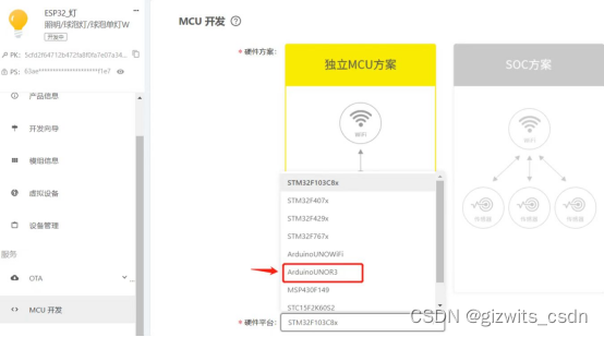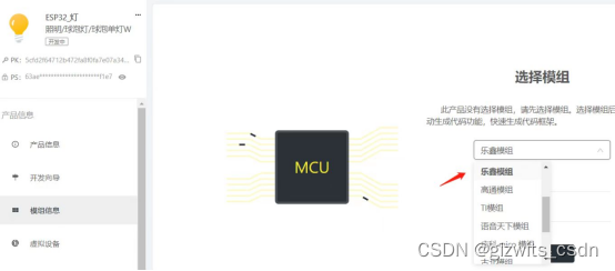 因为我这次用的ESP32模块,模组信息这里要选乐鑫模组。一般还要进行MCU或者SOC方案的选择,给你自动生成功能函数和配网函数供你写代码调用。