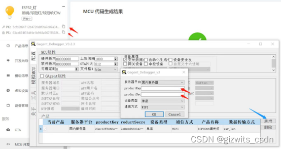我这里偷懒了,直接用电脑模拟MCU。调试助手里面新增一个产品,把刚刚上面生成的PK和PS填入,点击OK。