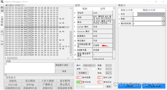 然后手机APP上点击灯开关,调试助手这里右边状态会马上反应,通讯窗口的代码就是我们要的MCU串口接收,然后判断进行IO口的电平高低或者PWM脉冲调整。