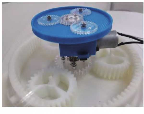 上层行星齿轮通过带动外环实现**树夹的转动,下层行星齿轮为了解决齿轮转动过程中电控部分接线的缠绕问题,在其上方设计有控制电池阀和舵机运动的单片机。两层通过电机的两轴连接,实现同向同步转动。通过电机驱动太阳齿轮转动,太阳齿轮带动3个行星齿轮转动,再带动齿轮架转动,经此过程实现树夹的圆周运动,实现树苗的储存和运送。行星齿轮如图2所示。