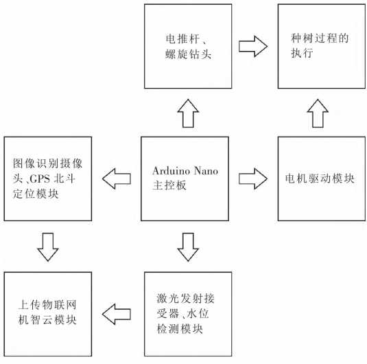主控板选用arduino Nano控制板,与电机驱动模块、图像识别摄像头、GPS北斗定位模块、电推杆、螺旋钻头、机智云物联网模块等外设相连,再通过激光发射接受器、水位检测模块等传感器采集信息,控制种树各个过程的进行。
