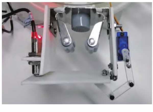 橡胶的挂钩当做树夹,利用橡胶轮和橡胶垫的固定实现稳定夹树的功能。设计三面限位装置包括左侧面限位装置、右侧面限位装置和正面限位装置。在树下落的过程中,与限位装置的回弹碰撞可以有效控制树的落下范围。所述的左侧面限位装置配有开门舵机,右面侧面限位装置配有电磁开合装置,正面限位装置与左侧面限位装置利用曲柄连杆与开门舵机连接,开门舵机和曲柄连杆的配合实现正面限位装置的打开,打开之后可以实现机械臂上树,上树过程结束,关闭正面限位装置,电磁开合装置吸住正面限位装置,实现限位的功能,如图3所示。