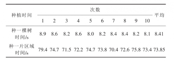 通过分析,制作了一种全自动高效智能种树小车实物模型如图7所示,尺寸为500 mm×300 mm×315 mm。对该实物模型进行了试验测试,数据如表1所示,完成一棵树的种植平均需要约8.41 s,完成区域10 m×10 m的土地种植平均需要约73.85 s。装置在试验测试过程中,种植过程顺利。