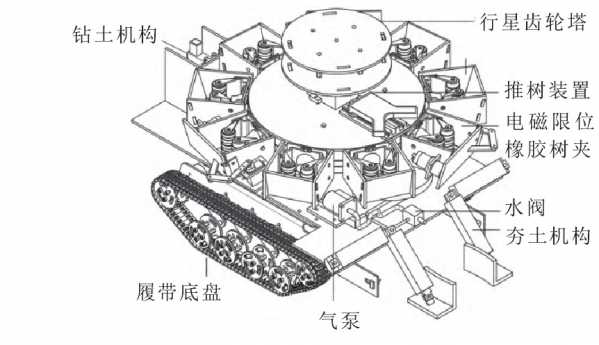 与此同时,行星齿轮塔带动树夹开始转动,当到达树坑上方时,停止转动。车继续向前运动,按照预先设置的树距,确保树夹夹的树正好位于已挖好坑的上方。推树的电推杆横向运动,推动树苗剥离开树夹,在限位装置的限制下,利用树和树底部本身的重力,竖直掉落在坑中。