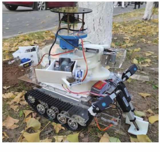 文章介绍了一种全自助高效智能种树小车,利用蓝牙模块、物联网机智云模块和GPS定位实现自动种植过程,包括运树、挖坑、下树、填坑和浇水。该装置能高效完成10m×10m土地的种植,平均每个树坑种植时间为8.41秒。文章还详细描述了装置的结构设计和电控方案,并通过试验验证了其功能和效率。