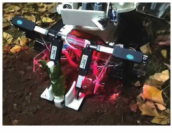 在车体后部合适高度处,确保电推杆完全伸出时能够达到夯土的目的,左右分别设置一组电推杆组成推土装置。每一组由两个电推杆垂直连接组成,水平方向的电推杆下方固定了一个倾斜角度为30°的推土装置固定块,确保水平方向的电推杆能够将树周围挖出的土聚集在一起。垂直于水平方向的电推杆顶端连接夯土板,可以根据土壤的平整程度自我调节压土的角度,并且同时左右前后移动,实现聚土和压土的功能,如图4所示。