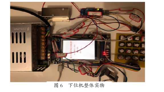 对系统结构分析之后,选取一个最适合的方案,并完成硬件的设计,之后完成编程与系统调试,先调试单独模块,最后级联调试,利用 Altium Designer 10 软件,对电路进行规则检查。软件方面用编程软件 Keil,在检查程序没有语法错误后,生成 hex 文件,烧录到单片机中。当用户试图打开一个锁时,必须先通过提供的键盘输入正确的密码。当输入密码不正确时,将通过手机 APP 发生警报,并在 TFT 彩屏上显示错误。下位机整体实物见图 6。