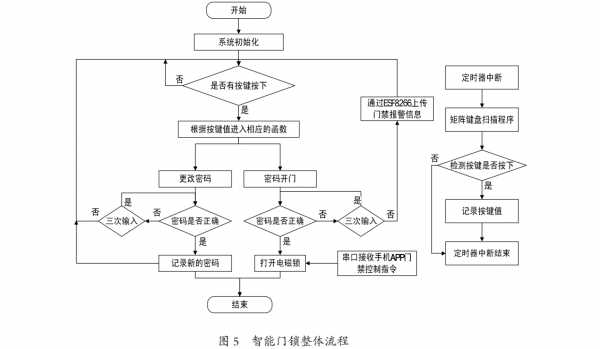 本系统用C 语言编写,主要由智能锁模块、显示模块、无线传输模块、矩阵键盘模块以及密码验证和密码更改这几部分的设计组成。智能门锁整体流程见图 5。
