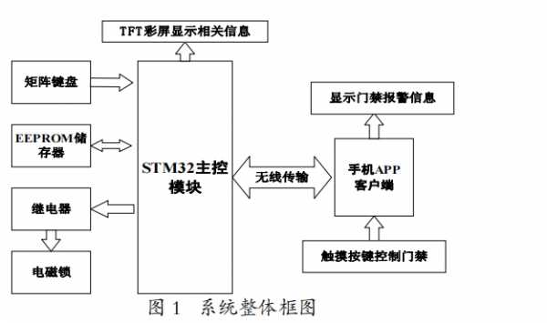 基于这些因素,选择 STM32 作为本设计的核心组件,使用灵活的设计、编程和多样端口 I/O,并控制它的准确性。使用外部 AT24C02 芯片存储密码并通过TFT 彩屏实现显示功能,利用无线传输将实物与机智云连接,在手机 APP 上显示是否处于正常状态和控制门锁开关。最后使用键盘通过输入密码来实现各个功能。系统整体框图见图 1。