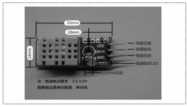每个DHT11传感器都在较为精确的湿度校验室中来校准。校准系数以程序的形式储存在OTP内存中, 传感器内部在检测信号的处理过程中要调用这些校准系数。单线制串行接口, 使系统集成变得十分快捷。极低的功耗、超小的体积, 信号传输距离可达30米以上, 产品为4针单排引脚封装, 连接十分方便。模块电路图和产品图片如图2.2-4和2.2-5所示。