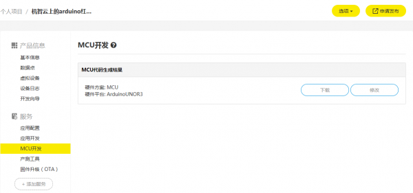 第四步:前往“MCU开发”部分,选择独立MCU方案,硬件平台选择ArduinoUNOR3,填入产品秘钥,生成代码包即可得到工程文件。下载。