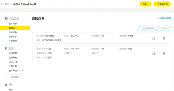 第三步:创建数据点。数据点是产品功能的抽象,用来描述产品功能及其参数。本次试验我们准备通过传感器,检测区域范围内是否有障碍物,如果有,传感器输出的数值会有一个大的变化,因此设置一个数值型数据。另外,为了更直观感受到手机APP的控制作用,设置一个布尔型数据用来控制灯的亮灭。保存。