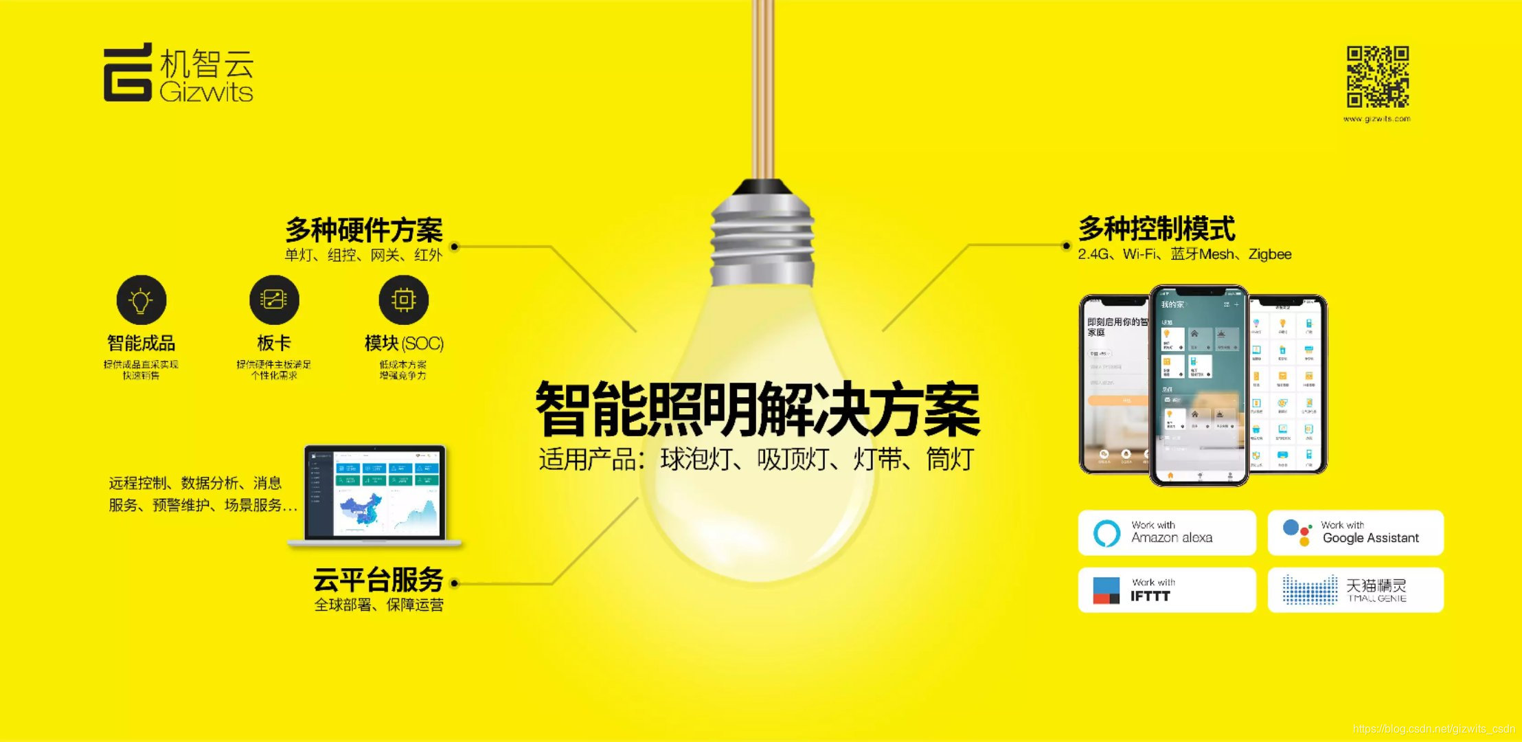 机智云提供一站式智能照明解决方案,包括通讯模块、控制端APP、IoT云平台等,支持球泡灯、吸顶灯等产品智能化,具备语音控制、场景模式等功能,加速产品上市,提升用户体验。