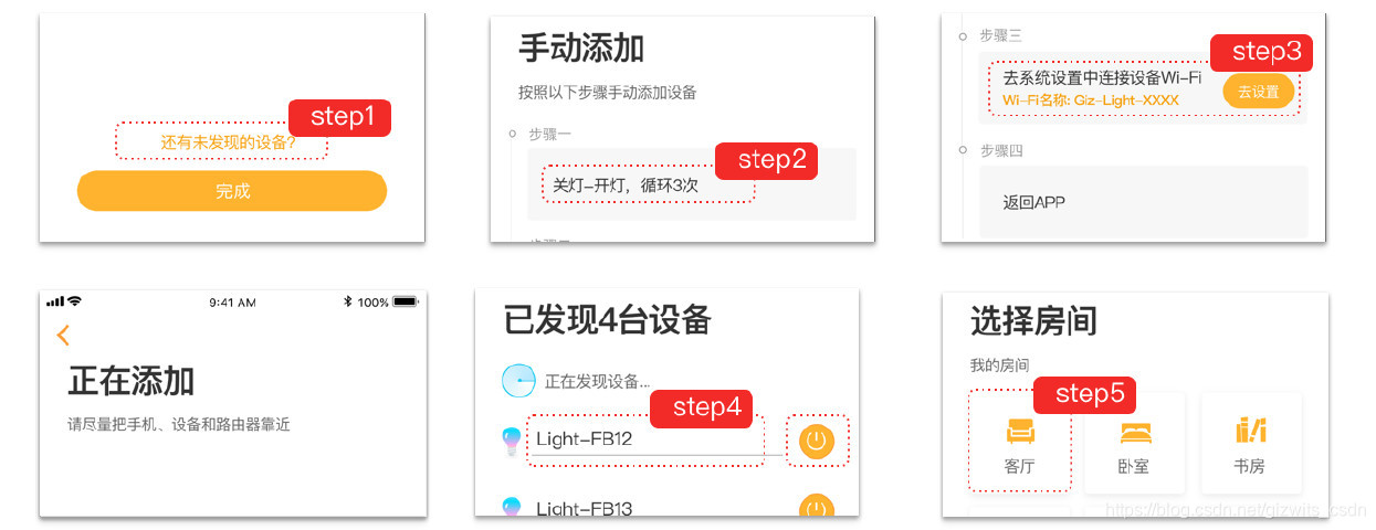 b. 手动添加:在已发现的设备列表下方点击“还有未发现的设备”,根据配网提示,开关灯3次,待灯处于闪烁状态后进入手动配网状态,iOS需要到手机系统设置中去连接设备热点,Android会自动连接设备热点,连接成功后等待配网完成即可。