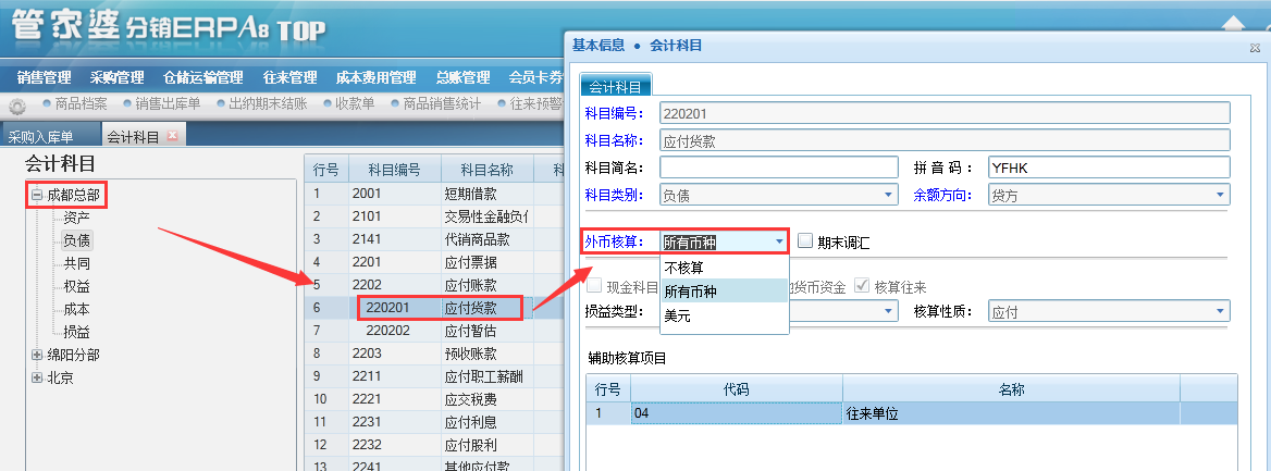 A8在基础资料——基本信息——会计科目——里面找到对应分支机构的单据上表头的往来科目打开后,将外币核算选择所有币种即可。