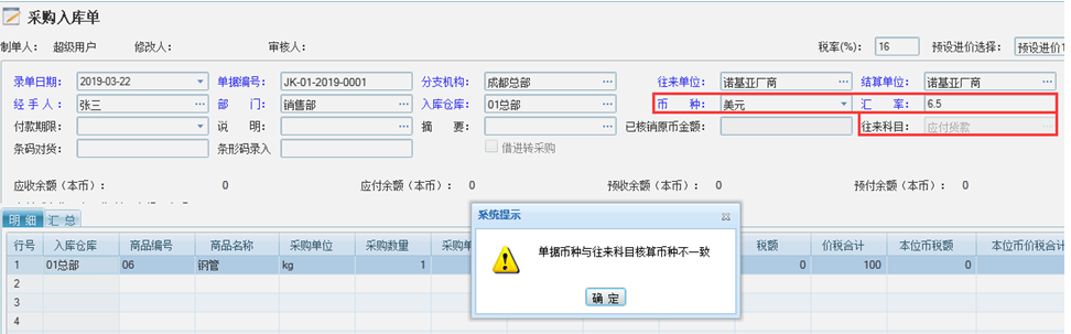 问题描述3:做单过账提示:单据币种与往来科目核算币种不一致。