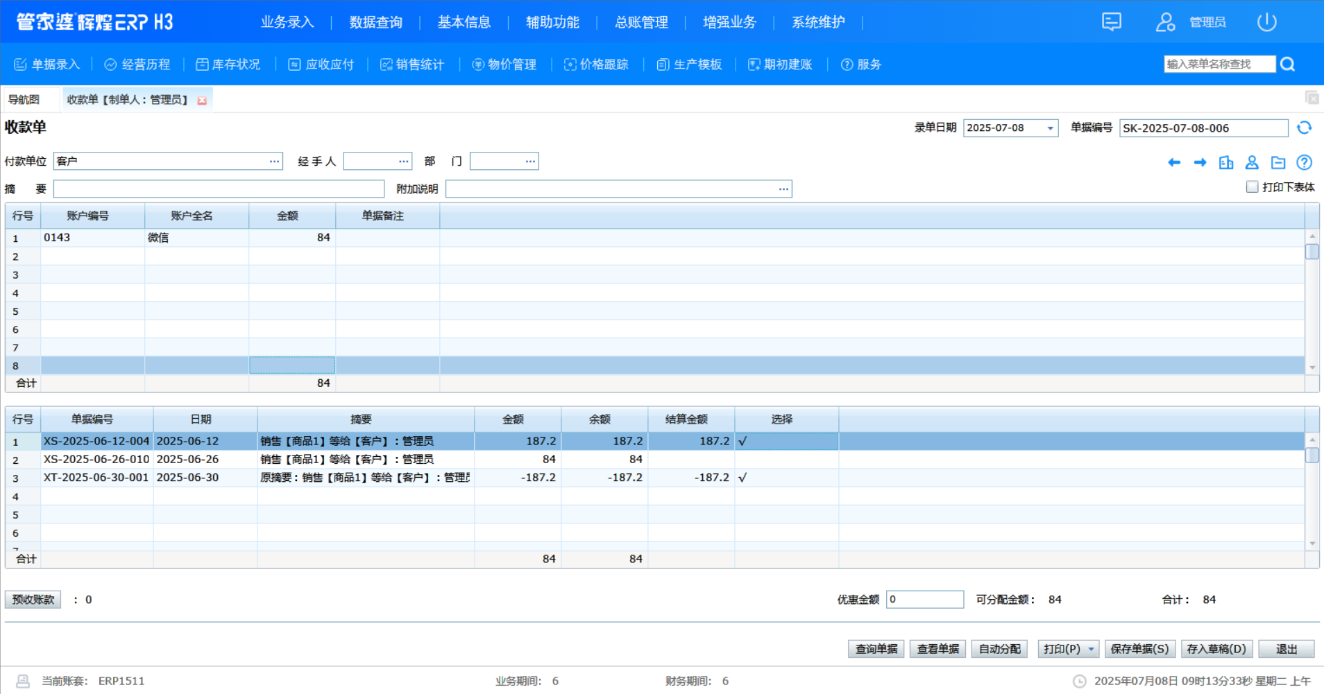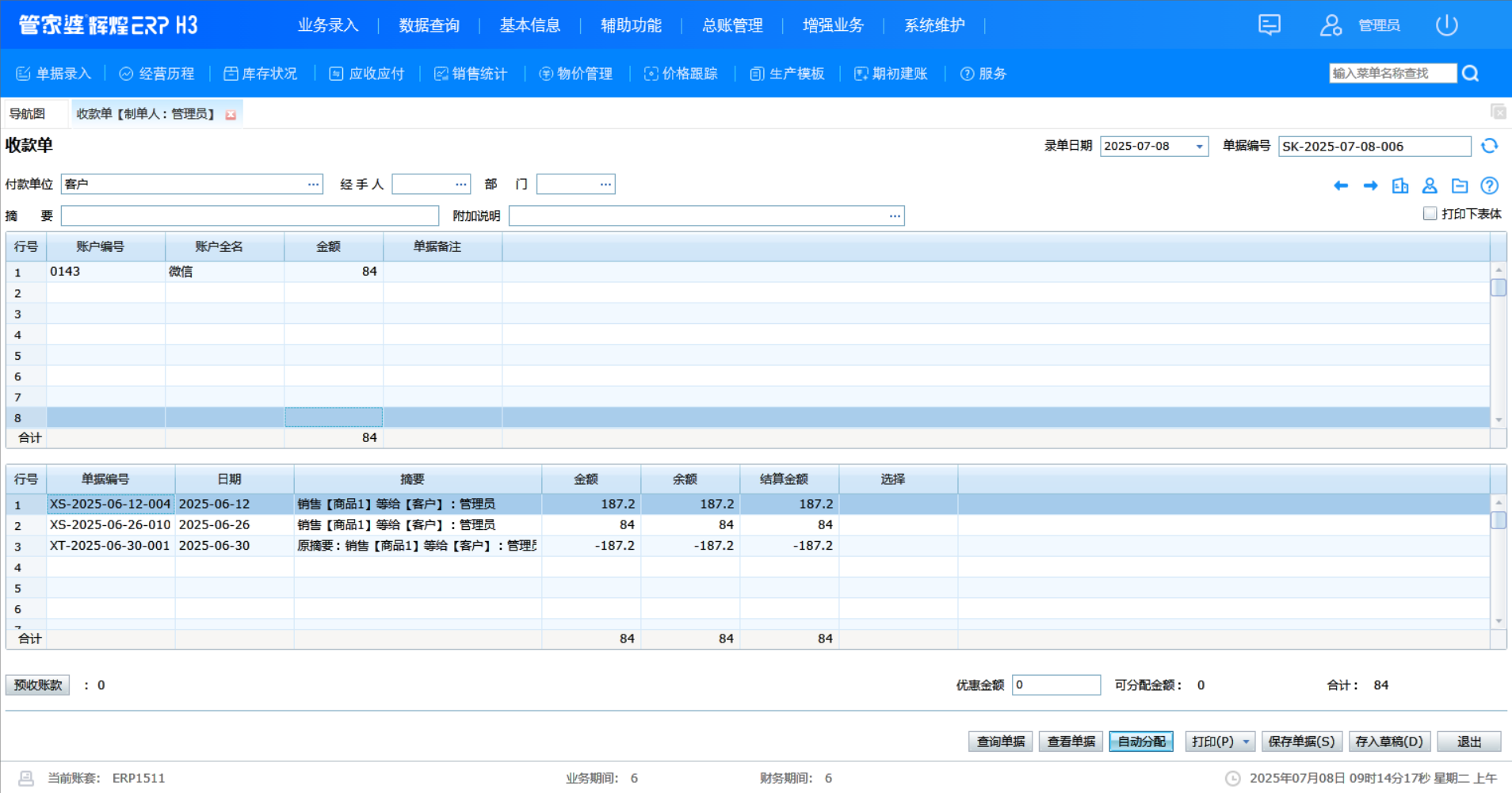也可以使用自动分配,在录入本次收付款的账户以及金额后,点击自动分配,自动对应未结算的单据,注意自动分配优先选择账龄长的单据。