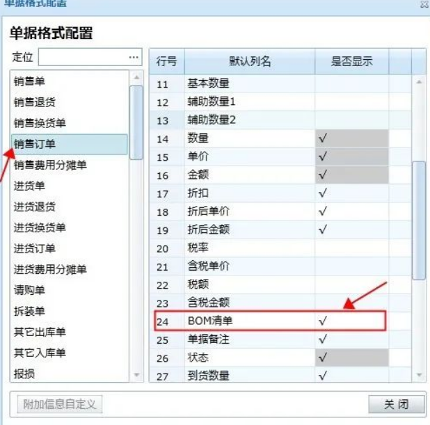 1、需要先在辅助功能——单据格式配置——销售订单——勾选上BOM清单,如下图: