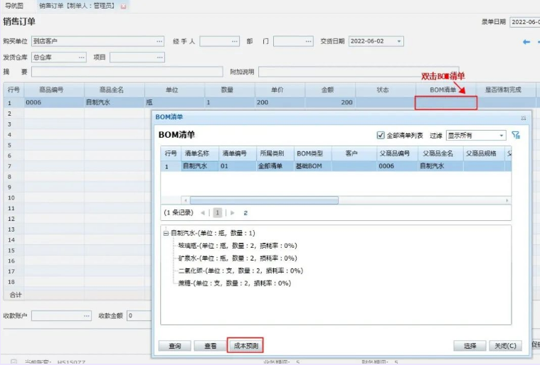 2、打开销售订单——选中成品后——双击BOM清单列的单元格,即可弹出与之关联的BOM清单。