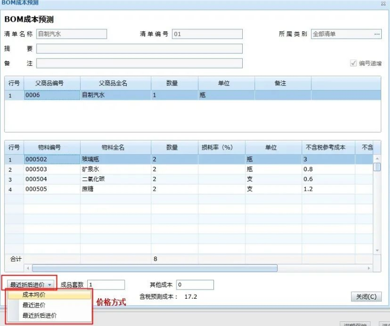 3、点击【成本预测】按钮,即可进入到如下界面,【价格方式】按钮选项为:成本均价、最近进价、最近折后进价,切换后参考成本将按照选中的价格展示: