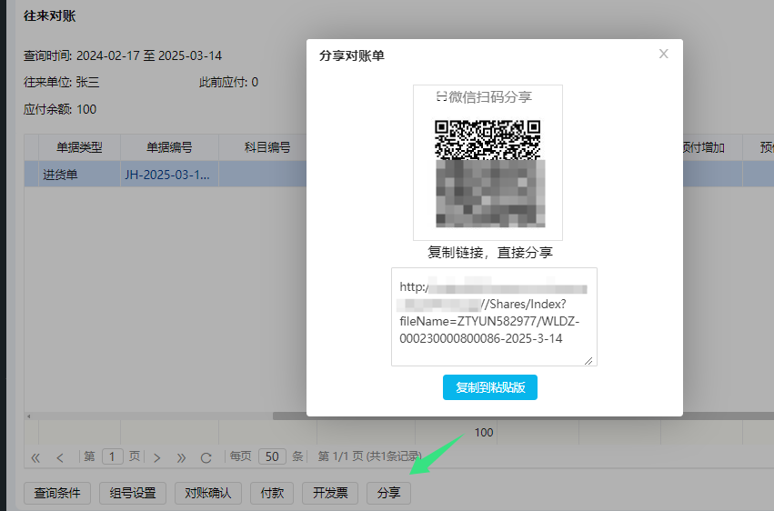 操作路径:钱流管理-往来对账-分享 支持微信扫码或者是复制链接直接分享。