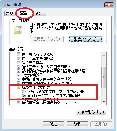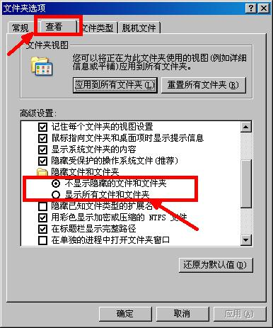 2、之后点击查看,在高级设置中选择显示所有文件和文件夹,把隐藏文件夹显示出来。