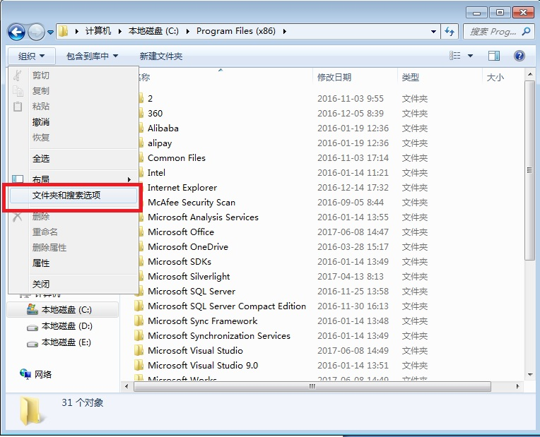 1、C盘/ Program Files文件夹(64位系统是打开C:\Program Files (x86))(32位系统在C:\Program Files),点开左上角的组织——文件夹和搜索选项。