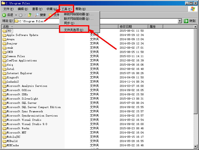 1、打开c盘的Program Files文件夹,接下来点击工具栏的工具,打开文件夹选项。
