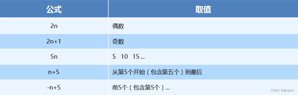 常见的公式如下(如果 n 是公式,则从 0 开始计算)