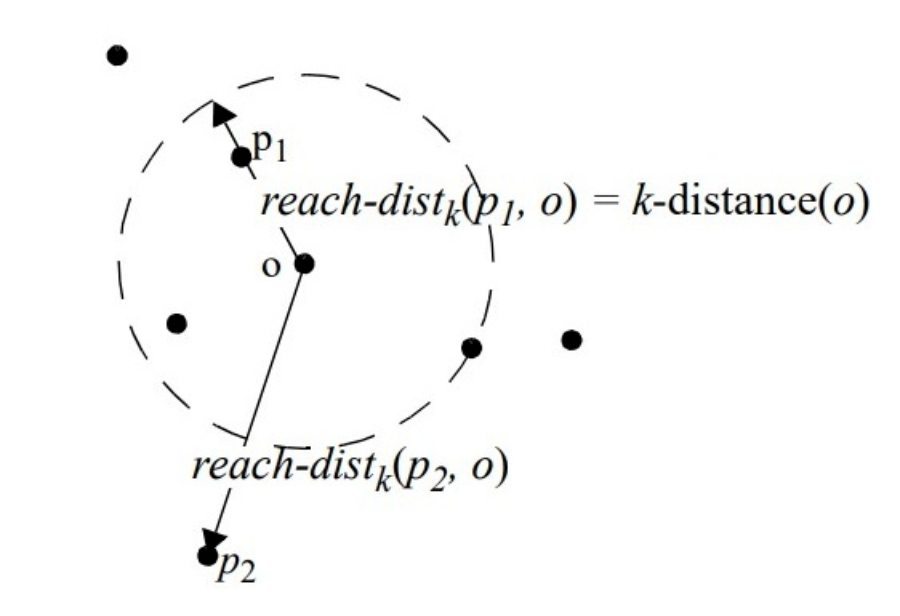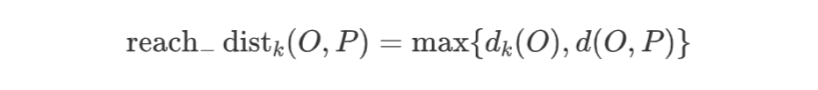 点P到点O的第k可达距离=max(点O的k近邻距离,点P到点O的距离)。