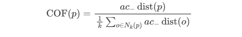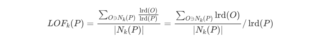 数据点P的局部相对密度(局部异常因子)=点P邻域内点的平均局部可达密度 跟 数据点P的局部可达密度 的比值: