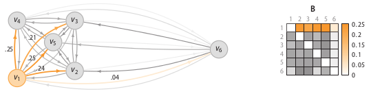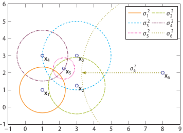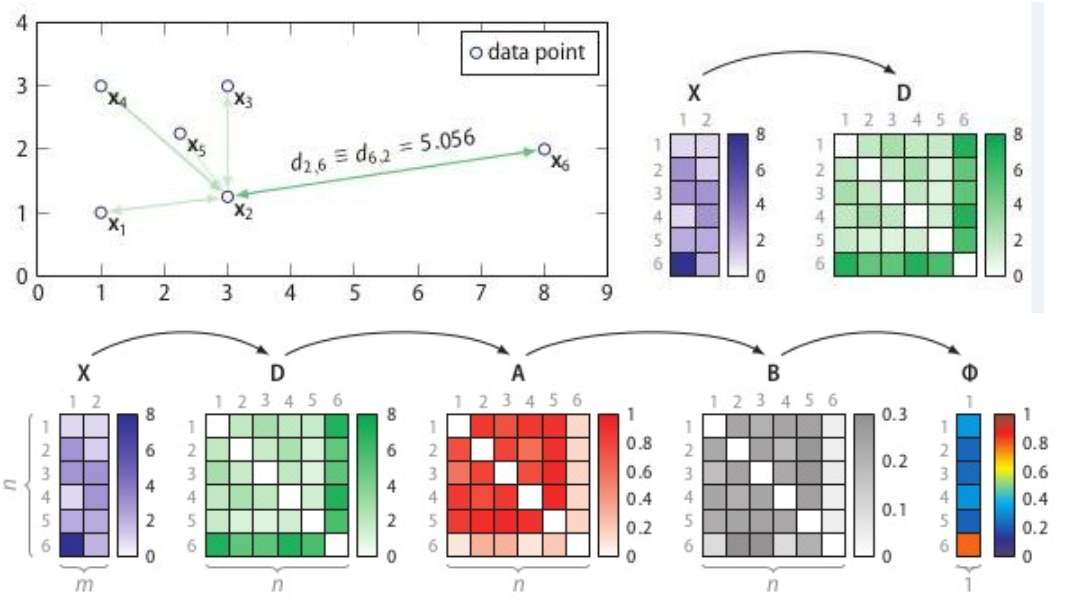 相异度矩阵D是各样本两两之间的度量距离,比如欧式距离或汉明距离等。关联度矩阵反映的是度量距离方差,如图7,点 的密度最大,方差最小;的密度最小,方差最大。而关联概率矩阵B(binding probability matrix)就是把关联矩阵(affinity matrix)按行归一化得到的,如图8所示。