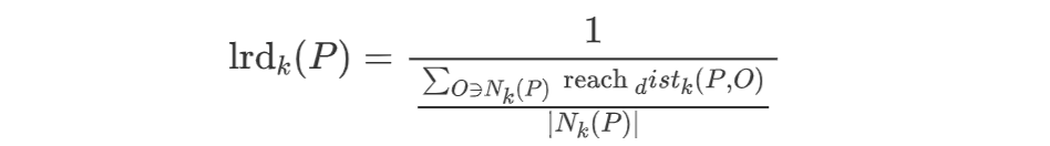 数据点P的局部可达密度=P最近邻的平均可达距离的倒数。距离越大,密度越小。