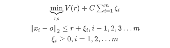 假设产生的超球体参数为中心 o 和对应的超球体半径r>0,超球体体积V®被最小化,中心o是支持行了的线性组合;跟传统SVM方法相似,可以要求所有训练数据点xi到中心的距离严格小于r。但是同时构造一个惩罚系数为C的松弛变量 ζi,优化问题入下所示: