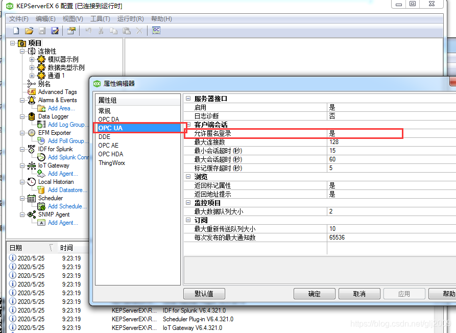 配置允许客户端匿名访问,项目-->属性-->属性编辑器-->opcua-->允许匿名登录:是。。。。然后重启程序,不行就重启电脑