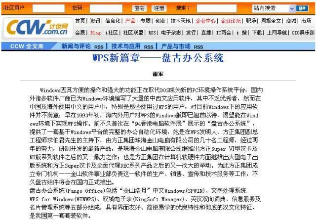 1995年雷军在《计算机世界》报第4期撰文《WPS新篇章——盘古办公系统》解释盘古组件