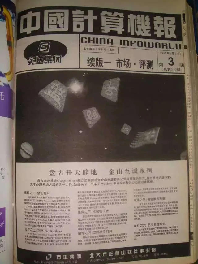 1995年1月17日金山盘古组件在《中国计算机报》上刊登的广告