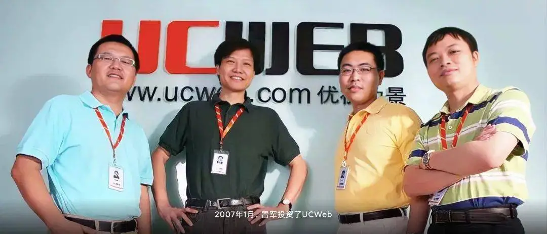 2007年1月,雷军投资了UCweb并任董事长,左二为雷军,右一为何小鹏