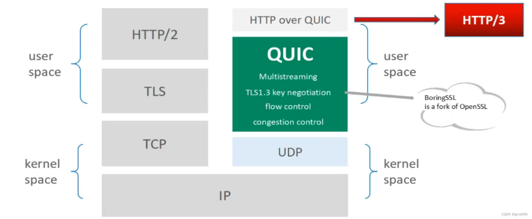 HTTP3和QUIC关系的理解:QUIC实现在用户态,但是仍任务QUIC其是传输层的协议(因为其主要功能仍然是传输数据),而http3是应用层的协议。HTTP3的核心是QUIC协议。HTTP3是对TCP传输协议的升级,而不是彻底的颠覆。