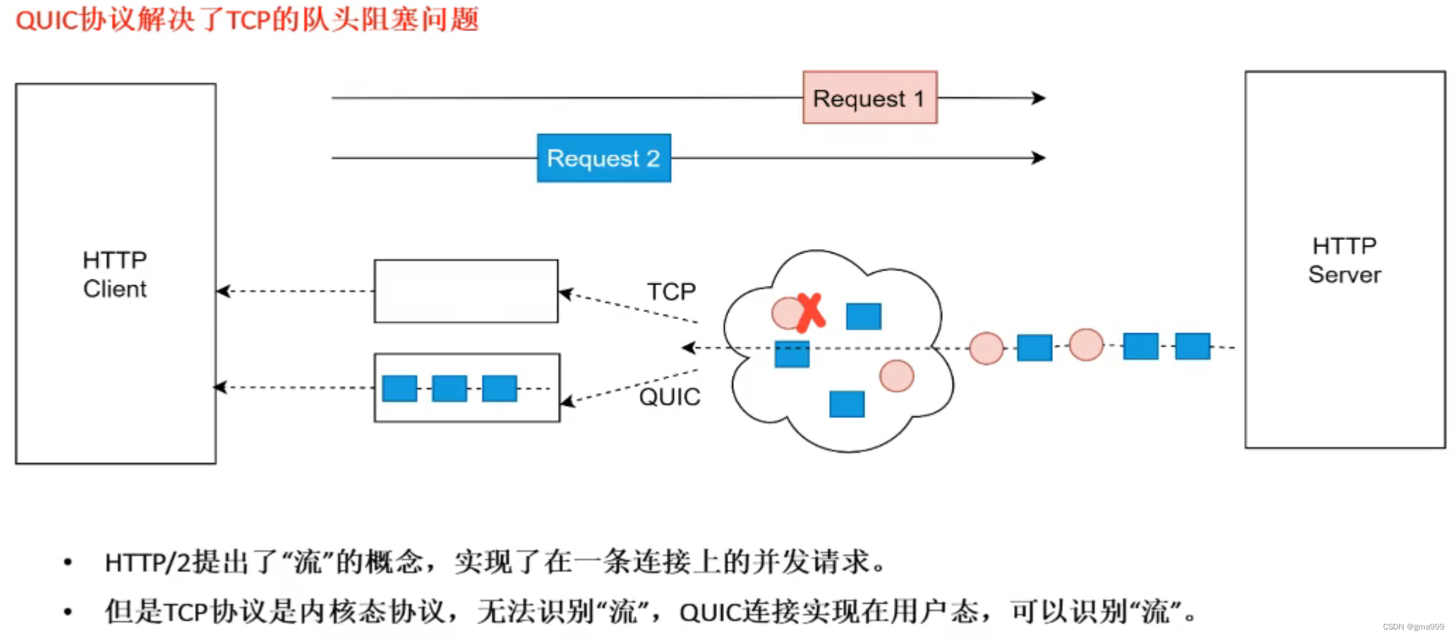 在网页请求更具体来说,TCP连接中,网页上的每个资源是按批次到达,但是QUIC不同。每个资源请求都是独立,即使其中一个请求出现问题(假如图片请求)其他的请求也可以先正常到达,在整个过程中只使用了一个UDP连接,但是实现了多个资源的传输。