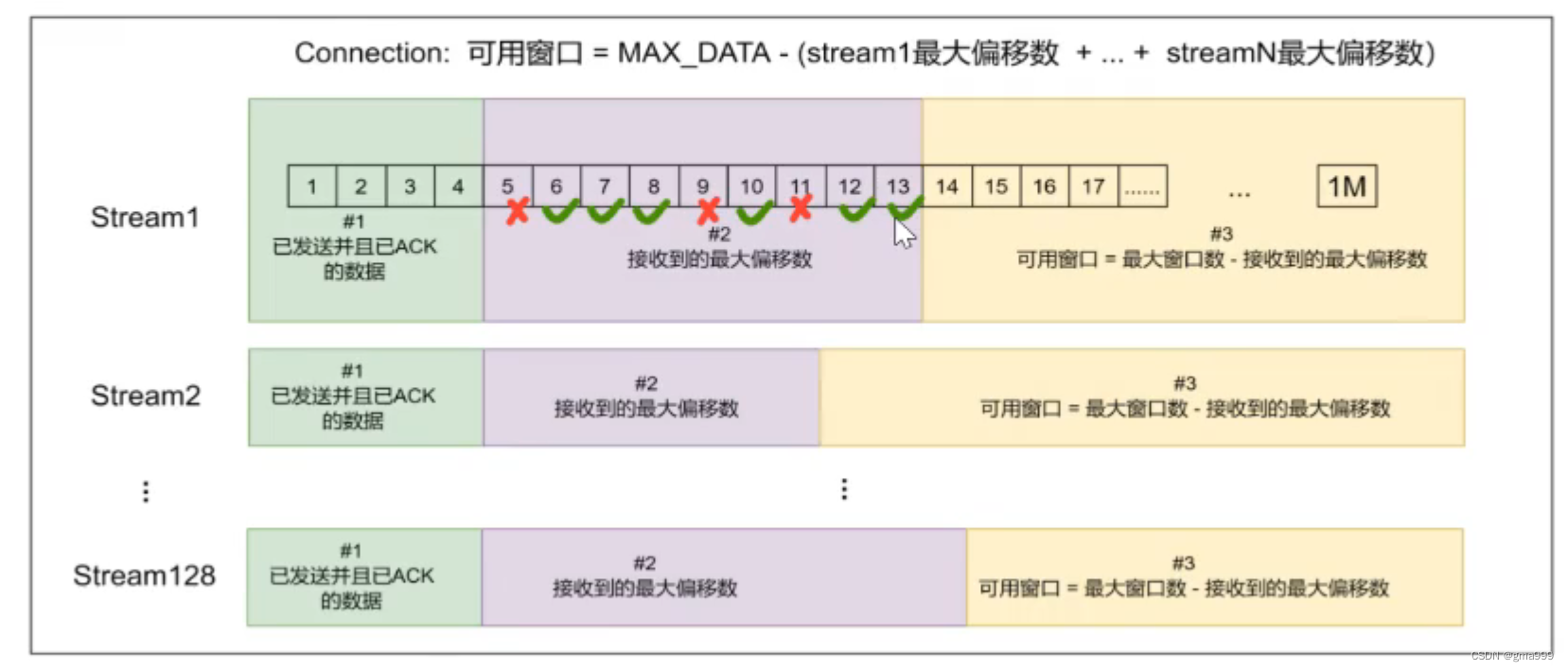 TCP的滑动窗口会受到数据包丢失影响,因为TCP下如果出现数据包丢失就不可以继续发送数据。QUIC的可用窗口则不受该影响。