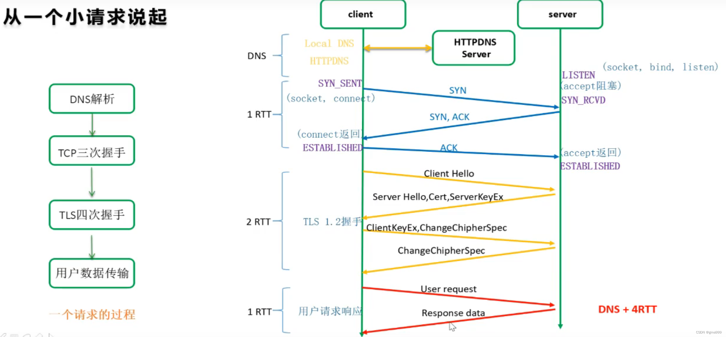 请求实现基本流程: DNS解析(域名转换为ip地址)、TCP三次握手(服务端确认)、TLS四次握手(传输通道的数据加密,目的是让通信双方能够获得解析信息的以“钥匙”“)、用户数据传输。