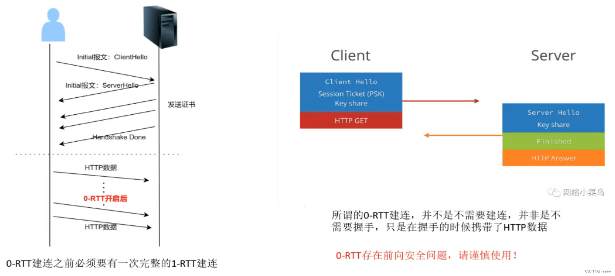 0-RTT表示不消耗时间就可以握手成功建立连接。但是首次连接之前需要进行一次RTT握手。通过握手的时候携带了http数据。类似于两人第一次见面时已经商量好暗号发送信息,后续的信息发送只要加上该暗号就可以发送专属于两者的加密信息。