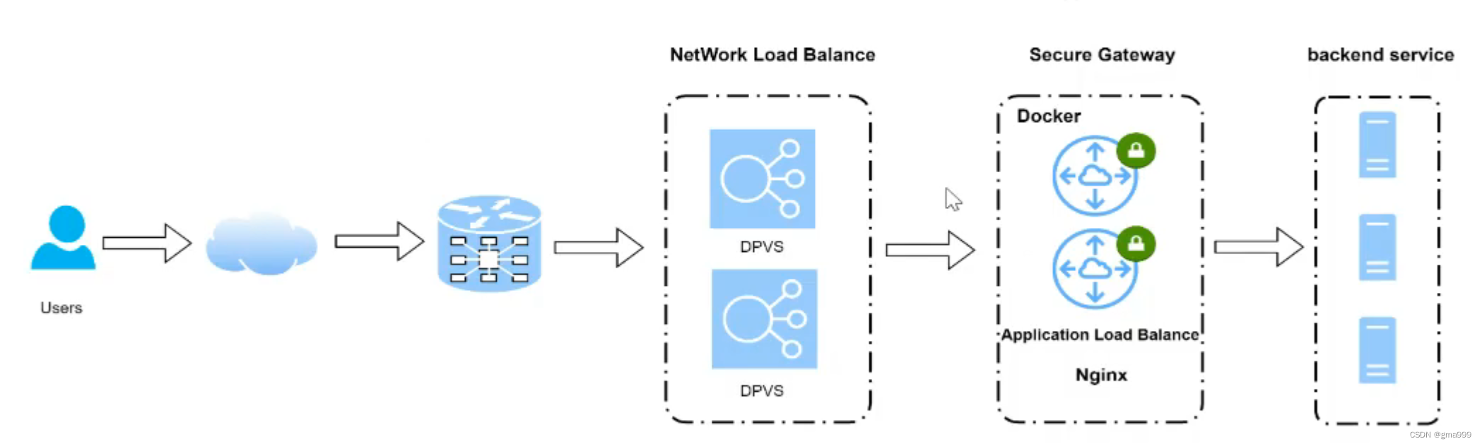客户端到达服务端之间,经过两个负载均衡器,四层负载均衡器(网络负载均衡)和七层负载均衡器(安全网关)