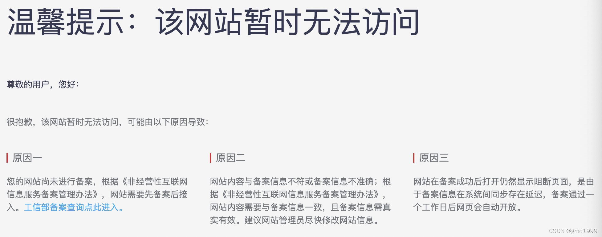 浏览器输入域名后,显示以下截图内容,就说明域名需要备案了。